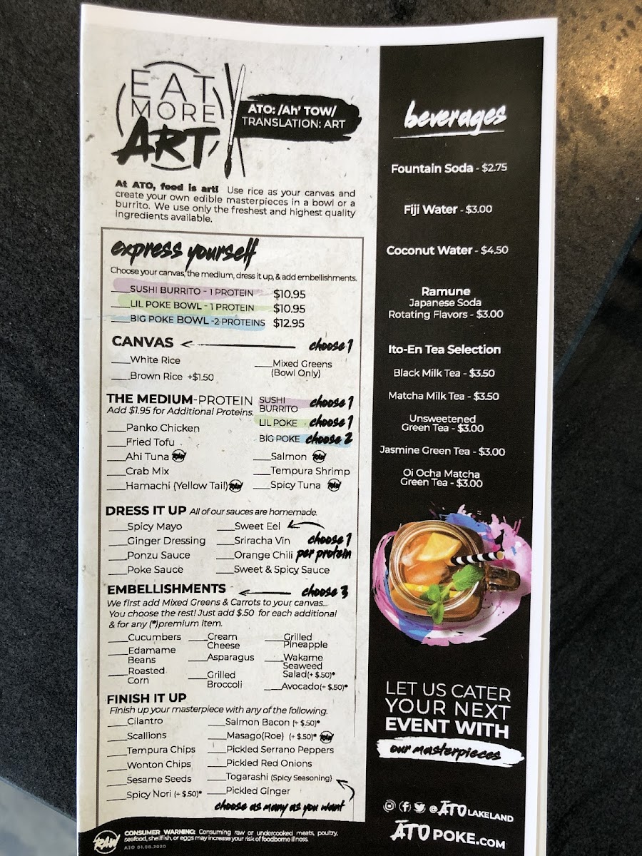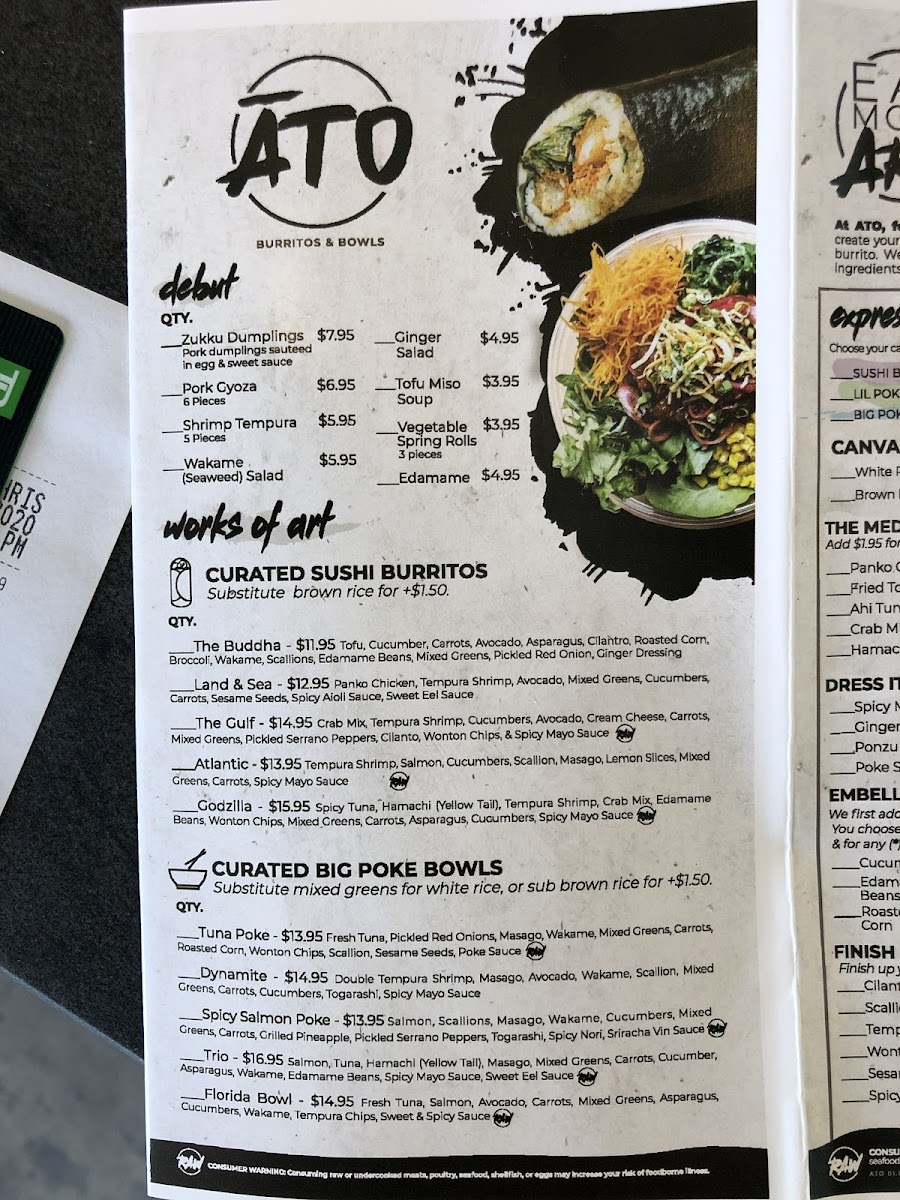 Zukku Sushi’s menu feels thoughtfully curated yet approachable, offering a satisfying range from customizable favorites to signature creations. The “Express Yourself” section invites flexibility with options like Sushi Burrito, Big Poke Bowl, and Poke Bowl, while the “Debut” starters-such as Edamame, Wakame (Seaweed) Salad, Zukku Dumplings, Vegetable Spring Rolls, and Pork Gyoza-set a flavorful tone. Standout “Curated Sushi Rolls” like the Zukku Roll (Raw), Shrimp Volcano Roll (Raw), Masterpiece Roll (Raw), Tempura Bagel Roll, and Lobster Volcano Roll showcase both creativity and indulgence. The poke selection continues strong with bowls like the Trio (Raw), Tiger Bowl, Dynamite Bowl, Spicy Salmon Poke (Raw), and Florida Bowl (Raw), while sushi burritos such as Land + Sea, The Kraken (Raw), and Tuna Lover Crispy Rice Burrito provide a fun twist on traditional formats. For purists, the Ahi Tuna Nigiri (Raw), Smelt Roe Nigiri (Raw), Spicy Tuna Sashimi (Raw), Salmon Sashimi (Raw), and Hamachi (Yellowtail) Sashimi (Raw) deliver clean, fresh flavors, complemented by familiar classics like the Salmon Avocado Roll, Spicy Tuna Roll, and California Roll. Refreshing beverages like Strawberry Lychee Green Tea and Pineapple Mango Agua Fresca round out a menu that balances innovation with comfort, making it appealing to both adventurous diners and traditional sushi lovers alike.